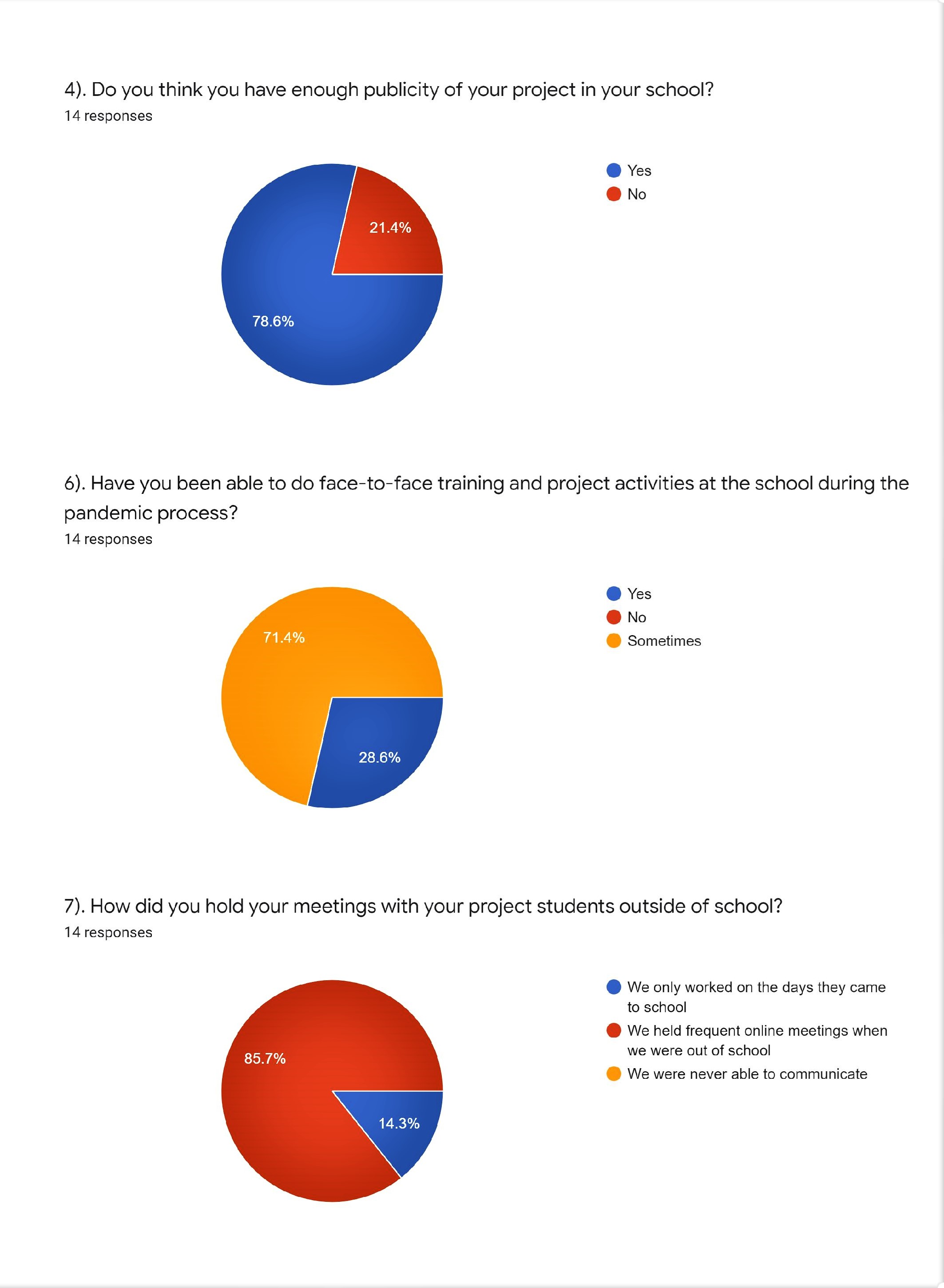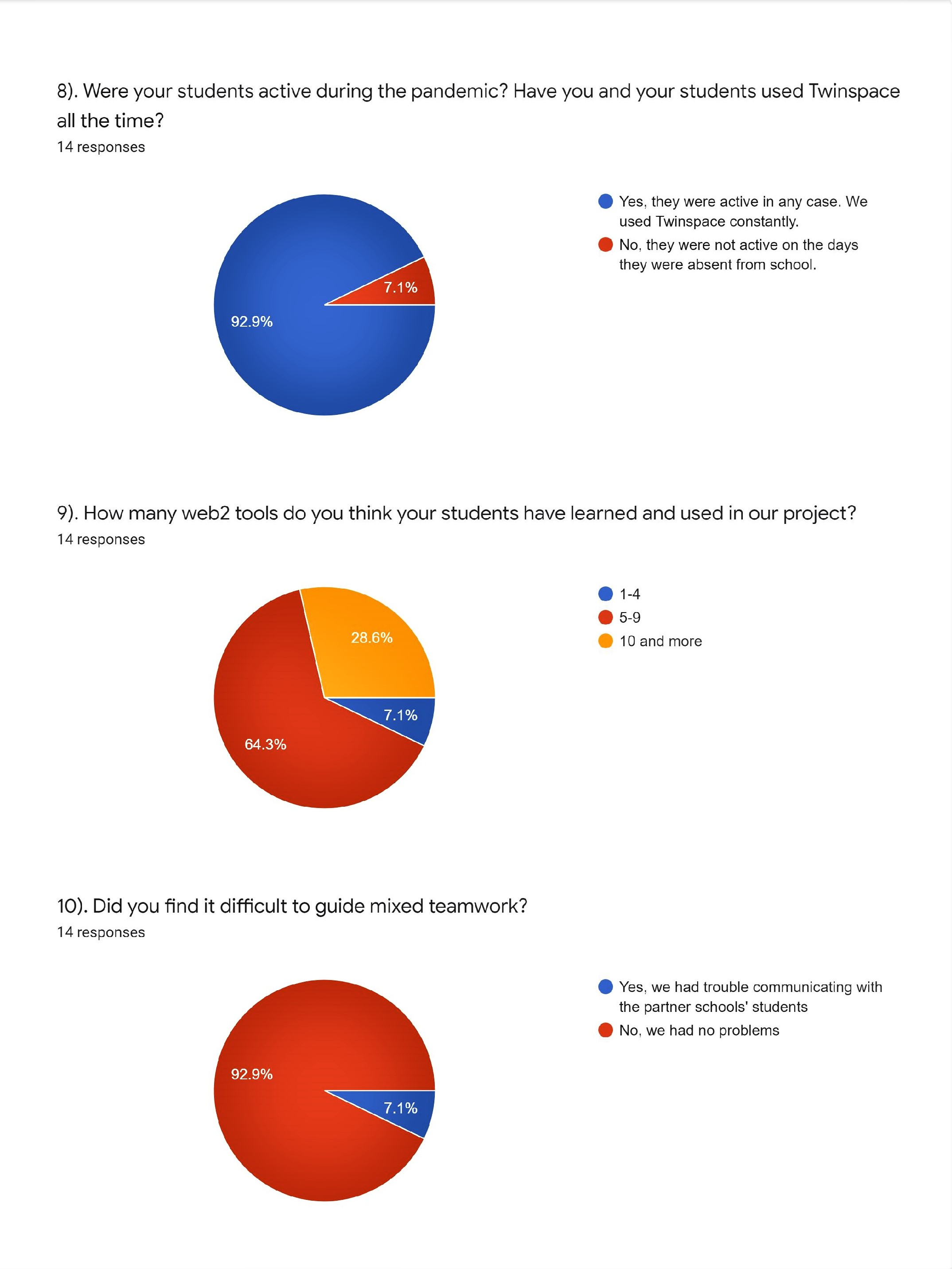 Većina nastavnika (78,6%) samo je ponekad bila u mogućnosti održati edukacije i projektne aktivnosti uživo u školi tijekom mjeseci pandemije, pa su se sastanci sa učenicima jako često održavali virtualno – 85,7% nastavnika se izjasnilo da je tako moralo raditi. Učenici su u svakom slučaju svejedno bili aktivni te su i nastavnici i učenici konstantno koristili Twinspace. Prema mišljenju nastavnika, većina je učenika uspjela naučiti i koristiti pet do devet Web 2.0 alata tijekom sudjelovanja u projektu, a nastavnicima nije bio problem voditi rad izmiješanih grupa, odnosno timova.