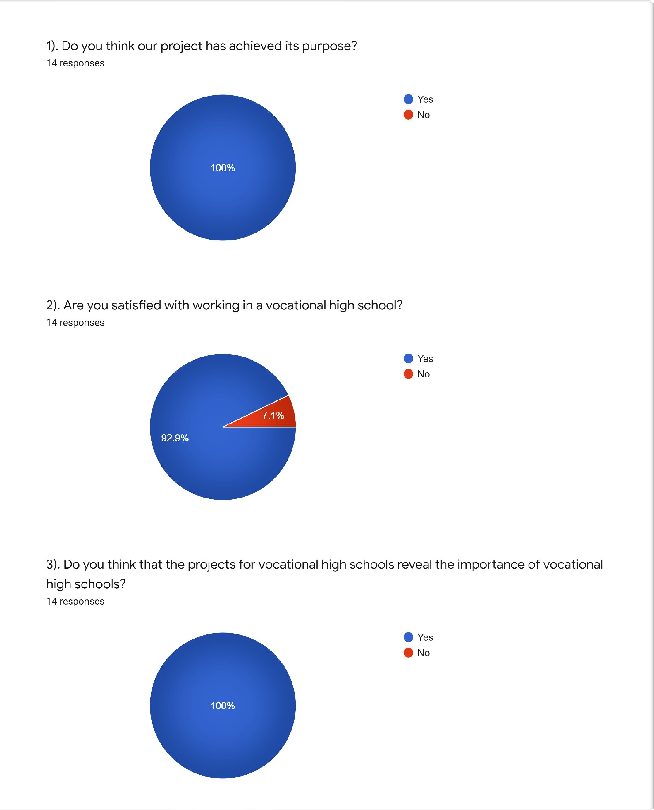 U ovom finalnom ispitivanju sudjelovalo je 14 nastavnika. Svi smatramo da je naš projekt ispunio svoju svrhu, odgovori svih nastavnika su afirmativni u tom pogledu. Nastavnici su generalno izrazili zadovoljstvo radom u strukovnoj školi. Svi nastavnici drže da je ovaj projekt otkrio važnost srednjih strukovnih škola. 78,4% nastavnika misli da su dali dovoljno prostora za promociju projekta unutar svojih škola, a smatraju i da su dovoljno predstavili projekt sredinama u kojima žive.