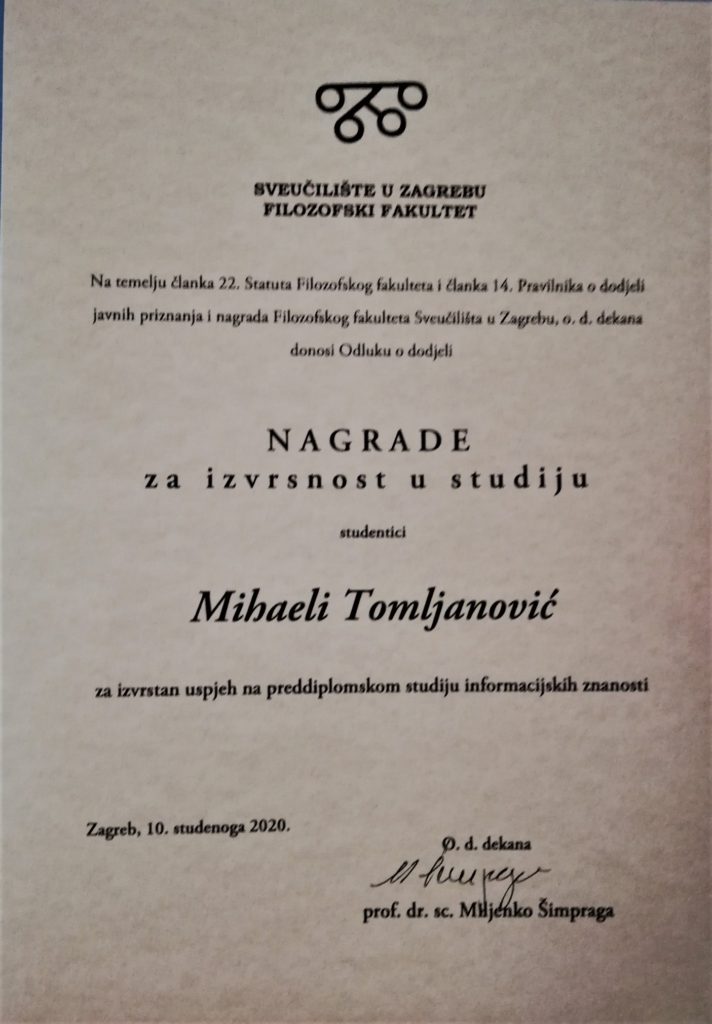 Mihaela Tomljanović pohađala je gimnazijski smjer naše škole, a za nastavak svog visokog obrazovanja izabrala je jednopredmetni studij informacijskih znanosti na Filozofskom fakultetu Sveučilišta u Zagrebu. To da je Mihaela dobra studentica nikad nismo ni posumnjali, ali vijest o njenim sjajnim rezultatima došla je kao ugodno iznenađenje u ovim vremenima kada se lijepe vijesti rijetko čuju.