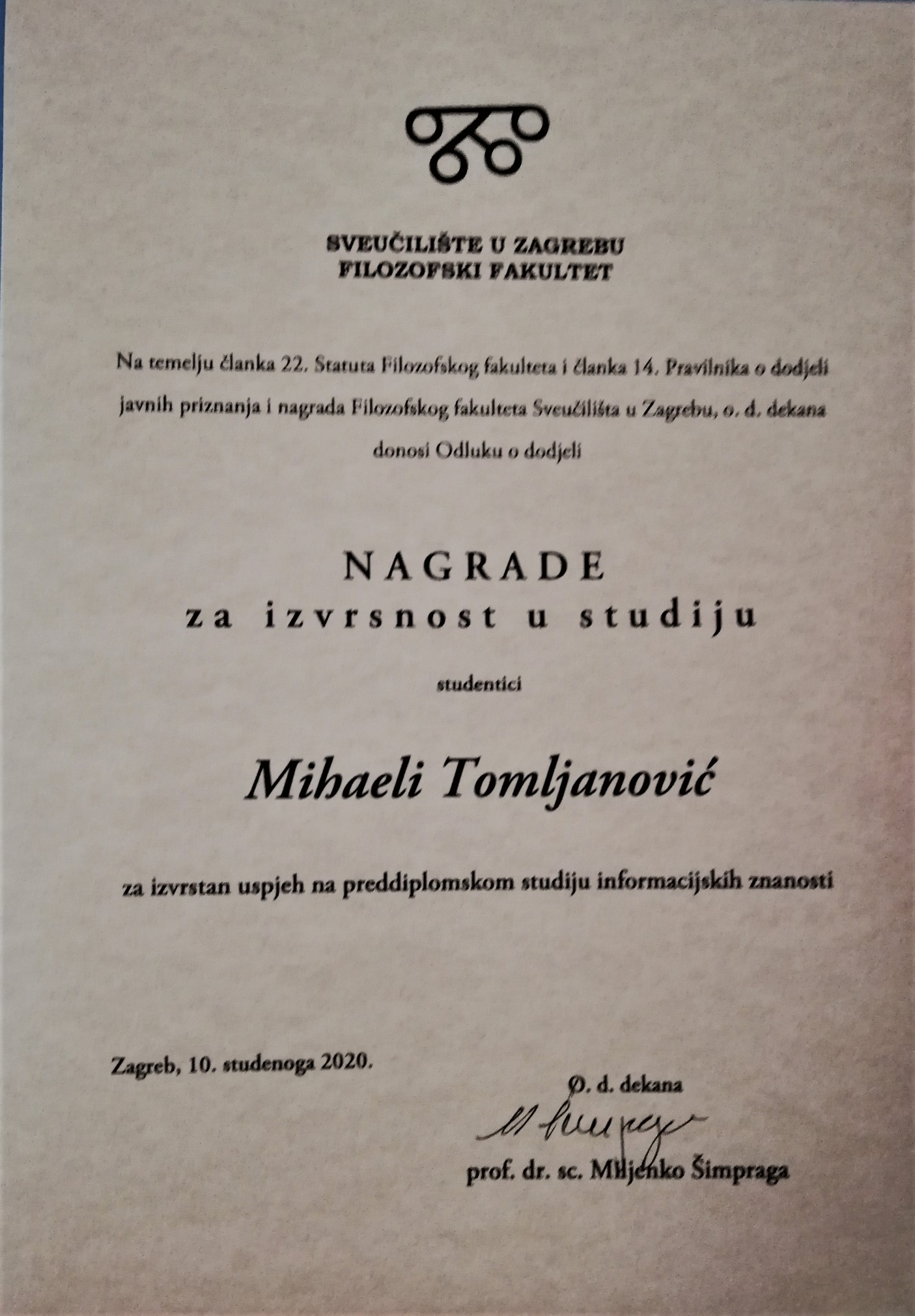 Da budemo potpuno transparentni, prilažemo i popis svih dobitnika Nagrade za izvrsnost u studiju zagrebačkog Filozofskog fakulteta, a ovim putem čestitamo Mihaeli i njenim ponosnim roditeljima te se nadamo da ovakvih nagrada i priznanja neće manjkati ni u budućnosti.