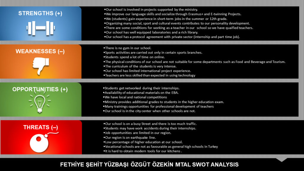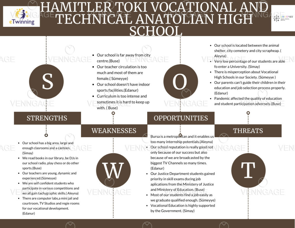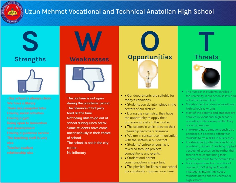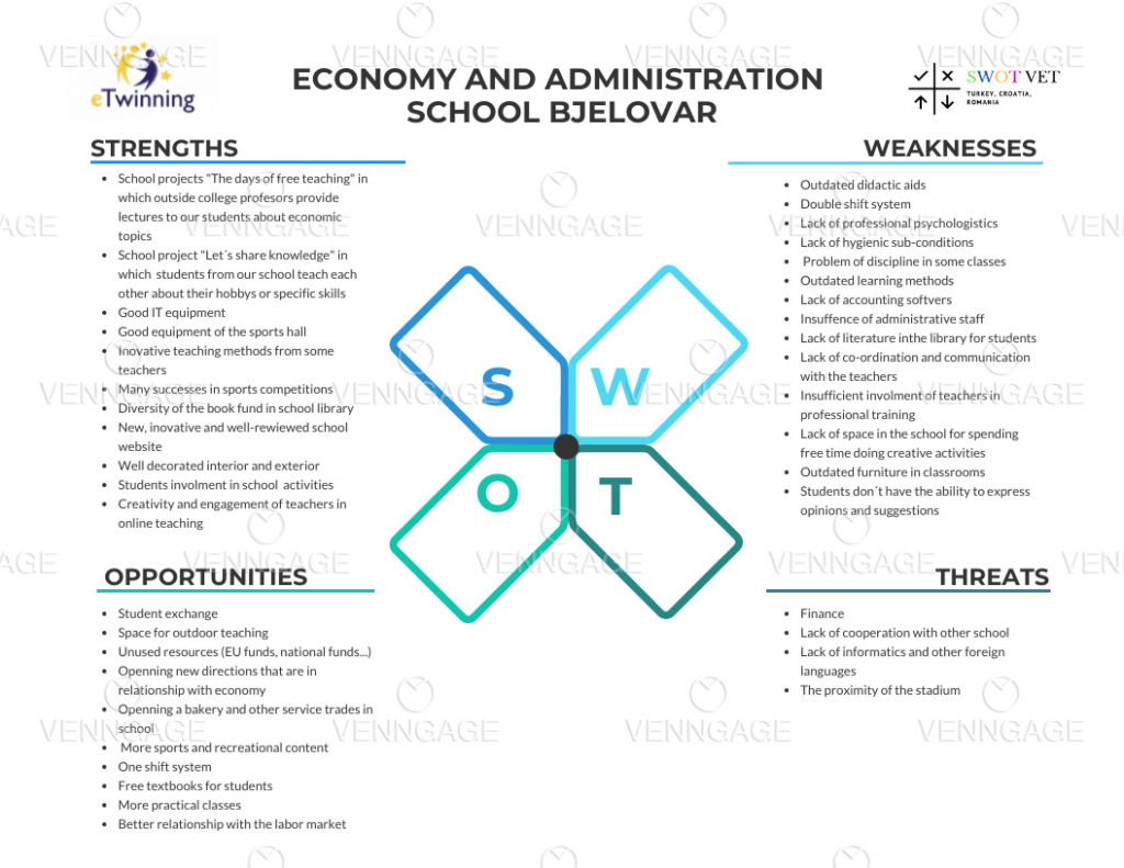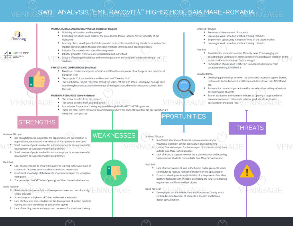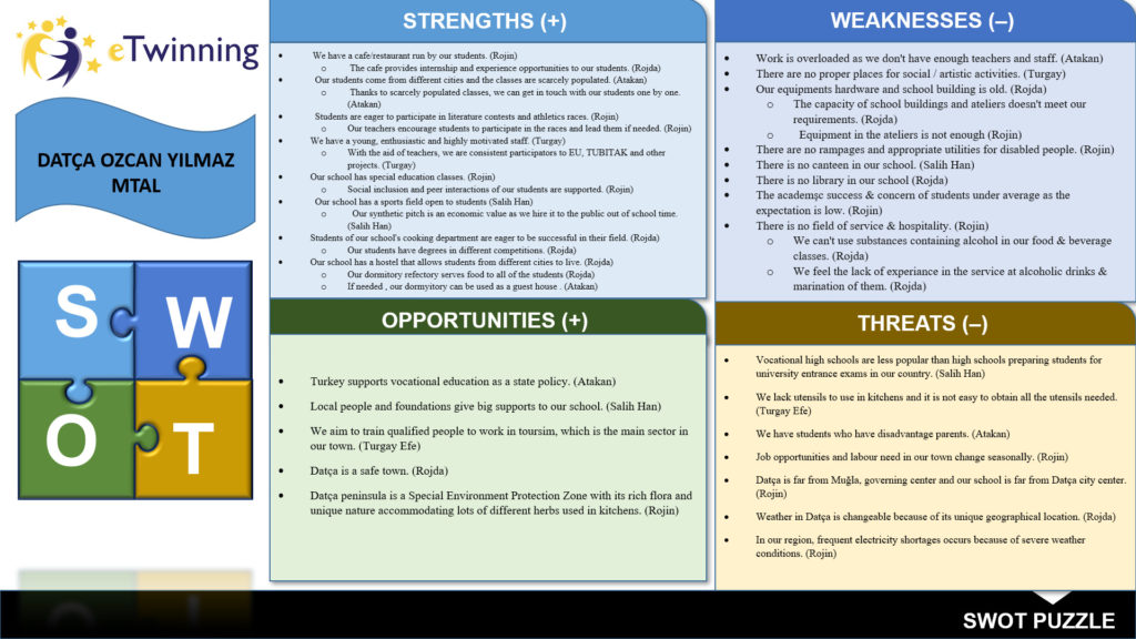Tijekom ovog, drugog polugodišta učenici uključeni u SWOT VET eTwinning projekt trebali su analizirati unutarnje i vanjsko okruženje svojih škola. Trebali su pronaći faktore koji njihove škole čine dobrim školama, one faktore koji bi se mogli poboljšati, izvanjske čimbenike koji bi ih mogli dovesti u bolju poziciju od trenutačne ili pak one koji bi mogli ugroziti neko područje njihovog rada. Sve od navedenog smo već objavili, jedan po jedan blog post za svaku od tema.