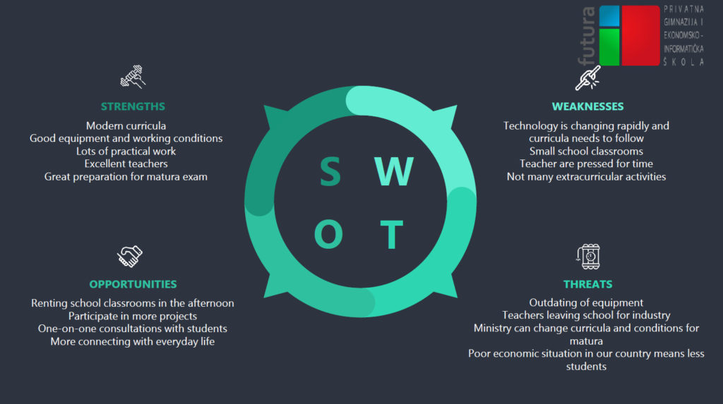 Od početka veljače do kraja travnja, provodili smo SWOT analize partnerskih škola, dio po dio, prateći pojmove koji stoje iza slova ovog akronima. S početkom svibnja došlo je vrijeme da svaka škola prikupi sve što je od početka godine naučila i sažme to u jednu veliku SWOT matricu koja sumira sve njihove snage, slabosti, prilike i prijetnje (eng. strengths, weaknesses, opportunities & threats – SWOT).